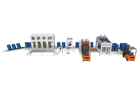 爬坡输送机、双头称重式灌装机、自动旋盖器组成。灌装流程:爬坡输送机放好空桶,设备自动进桶,灌装线净重灌装,灌装结束后自动出桶,自动旋盖,滑坡输送机送到地面后进行搬运。利用自流称重的工作原理来实现灌装量的控制